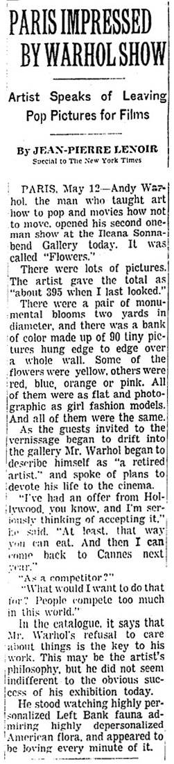 It was at the opening of the Flowers show at the Ileana Sonnabend Gallery (37 Quai des Grandes-Augustins, Paris) that Warhol's comment about being a retired artist was picked up by a journalist by The New York Times.