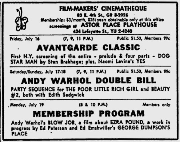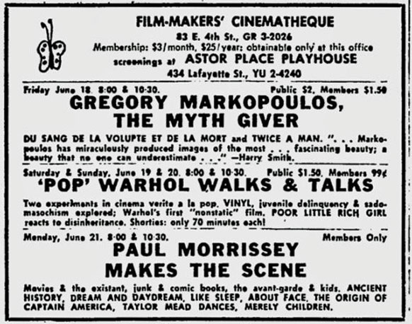 The Village Voice ad for the screening referred to Poor Little Rich Girl as Warhol's first "nonstatic" film. There was no mention of Edie Sedgwick. The ad also contained an announcement about an evening of films by PAUL MORRISSEY.