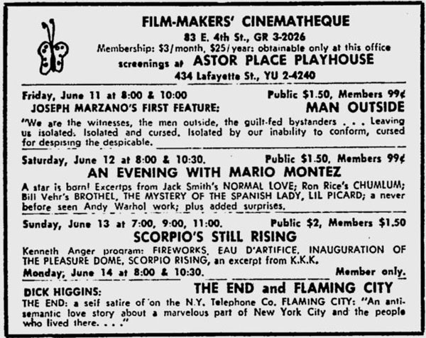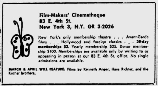 The ad for the Cinematheque that appeared in the March 18, 1965 issue of the Village Voice did not mention a screening of the film. It noted that "March & April" would include films by Kenneth Anger, Hans Richter, and the Kuchar brothers."