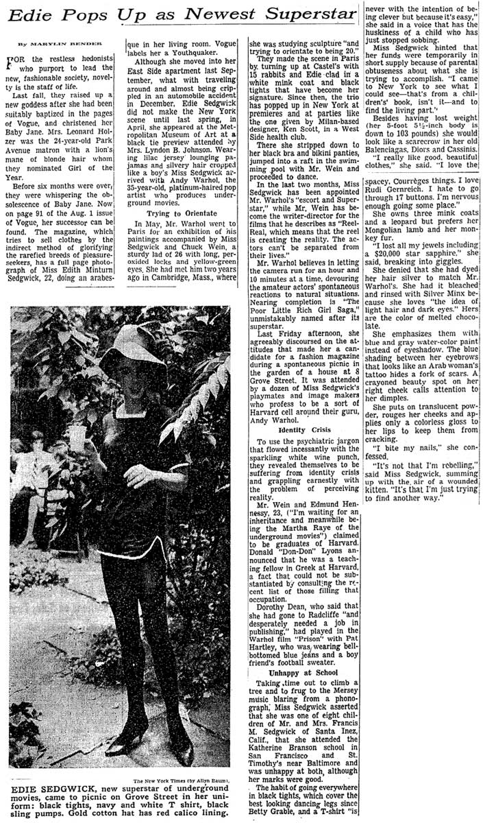 JULY 26, 1965: THE NEW YORK TIMES PROCLAIMS EDIE SEDGWICK TO BE BABY JANE HOLZER'S SUCCESSOR.