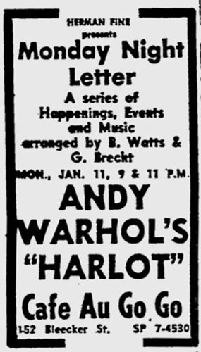 According to Warhol biographer, David Bourdon, the screening of Harlot at the Cafe au Go Go was the premiere although the date on the ad is January 11, 1965. (DB217)