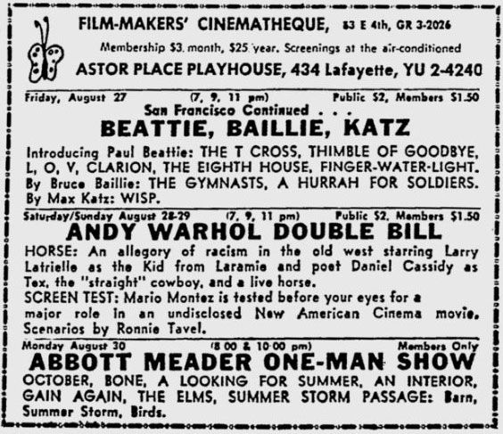 The Astor Place Playhouse was the cinema being used by the Film-Makers' Cinematheque at the time to show underground films. (X1) The film is referred to simply as "Screen Test" in the Village Voice ad but the description fits Screen Test #2.