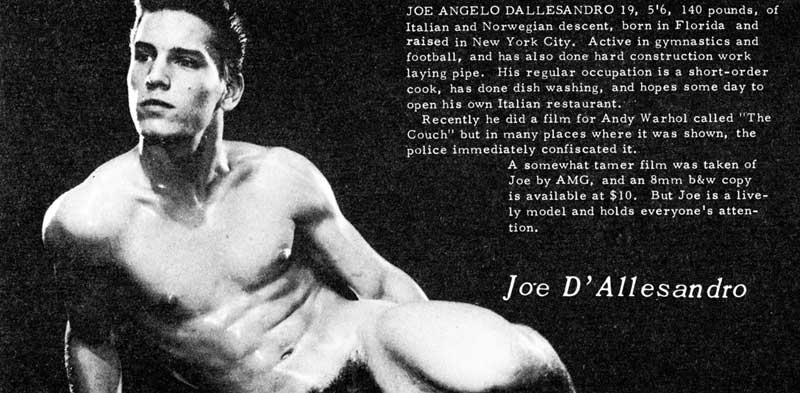 This description mentions an AMG film taken of Joe. A film allegedly of Joe sometimes circulates the internet but it's unclear whether it really is Joe having sex. It begins with a fairly clear image of Joe but the actual sex scene is unclear and clumsily edited. It also doesn't fit the description of the AMG film which refers to it as "somewhat tamer" than Warhol's film, Couch.