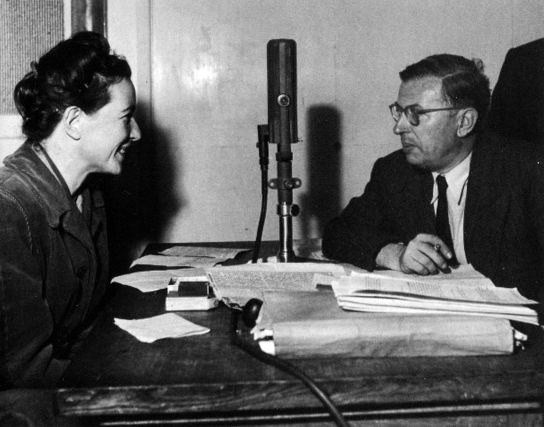 Simone de Beauvoir (L) and Jean Paul Sartre during radio broadcast, 1946