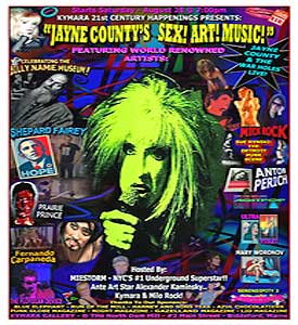 "The show, which had a successful run at the Chelsea Hotel in New York City, will include the art of Jayne County, who is being hailed as the 'Grandma Moses of Pop Art' along with recently discovered photographs by Warhol Superstar Billy Name, new work by Mick Rock and Tubes drummer Prairie Prince. Also represented in the show are Shepard Fairey, Anton Perrich, Rock photographer John Conroy, The Floydian Device, Underground artist Philly Abe, Detroit Punk Rock photographers, Sue Rynski and S. Kay Young, the Internationally renowned music group Muha, Warhol Superstars Mary Woronov, Louis Waldon, Ultra Violet, and the work of NY Antè Art Superstars Fernando Carpañeda, Miestorm, Ian Couch, Alexander Kaminski, Kymara and Milo Rock. The opening will also honor Warhol Superstar Billy Name and the opening of The Billy Name Museum in 2011. In the tradition of a 'Happening' spontaneous performance is encouraged."