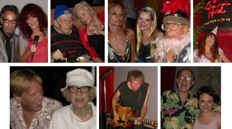 Top left to right: Host Neke Carson & Ruby Lynn Reyner (from Finishing Heaven); Superstar Taylor Mead & Sally Kirkland (one of Warhol's 13 Most Beautiful Women); actress (and daughter of Ivy Nicholson) Penelope Palmer with fashion designer Hillary Flowers and Hoop; Superstar Ivy Nicholson/Bottom left to right: Host John Gilman & Obie award winner Myra Carter; Joe Bendik; Playwright Robert Heide and Claire Henry from the Whitney (Photos by Hoop)