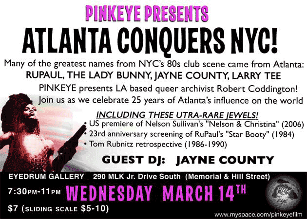 Pinkeye presents L.A. based "queer archivist" Robert Coddington on March 14th in an evening hosted by Jayne County at the Eyedrum Gallery in Atanta. The evening will include the U.S. premiere of Nelson and Christina, produced by Coddington from Nelson Sullivan footage. (The film will have its U.K. premiere at the London Gay and Lesbian Film Festival on March 28, 2007.) Also being shown during the evening at the Eyedrum is Ru Paul's Star Booty and a Tom Rubnitz retrospective. Details on the flyer here.