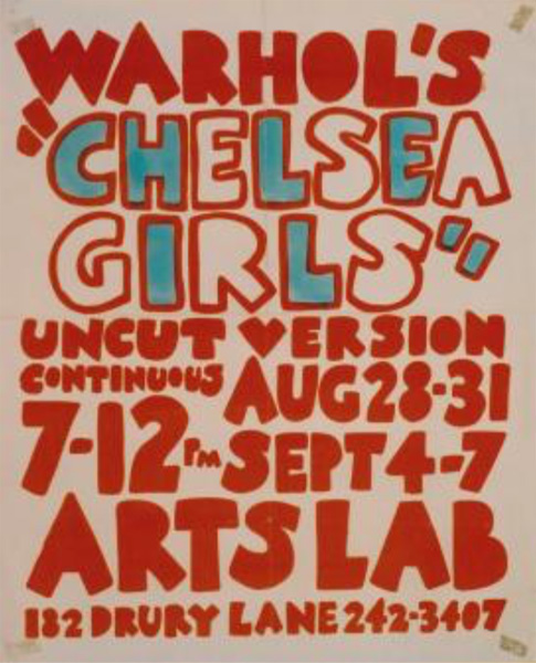 Poster for The Chelsea Girls at the Arts Lab in London (Source: Barry Miles, "Early Days of the Underground Scene" (blog), Lux, September 22, 2016, here.)