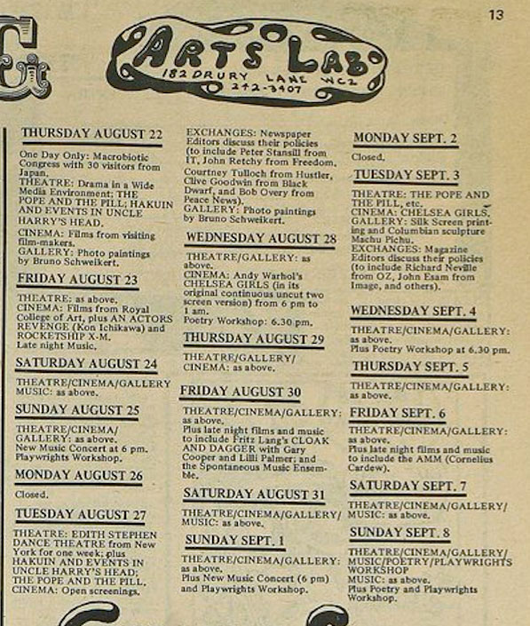 The screening of the film is noted in the schedule for Arts Lab that appeared in issues 38 and 39 of the International Times. The description confirms that it was being shown "in its original continuous uncut two screen version." (See schedule for Wednesday, August 28, below and the "Films" section in the following issue.)