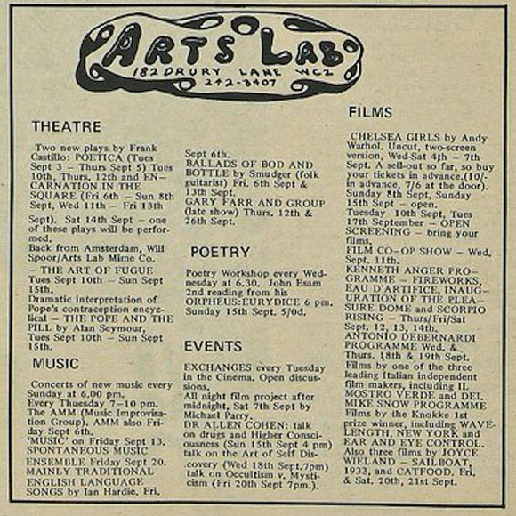 The Drury Lane Arts Lab was started by Jim Haynes in June 1967, with assistance of the co-founder of the International Times, Jack Henry Moore. The venue included a cinema, a theatre, an exhibition space, a book stall and a cafe. (JI3515) David Curtis who is quoted above in the International Times was involved in the programming of films at the venue. He notes, "We were the first place to show Warhol's Chelsea Girls as a two screen film. (Derek Hill had shown it earlier as a one screen film.)" (DCI)