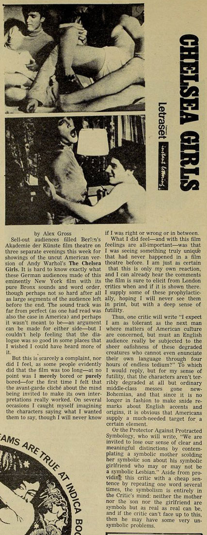 The "boredom" of the film had been noted in Roger Ebert's review of the Chicago screening and was also mentioned by the underground press. William Rotsler wrote in Adam Film Quarterly, "In one film alone - Chelsea Girls - he [Andy Warhol] has sadism, masochism, whipping, transvestites, homos, prostitutes, a homosexual 'Pope," boredom, stunningly beautiful girls, depravity, humor, 'psychedelics,' boredom, truth, honesty, liars, poseurs, color, black and white, split screens (two reels are projected at once), boredom, and it's four hours long." (William Rotsler, "There's a New Kind of Film: The Underground Movement," Adam Film Quarterly, No. 3, November 1967)
