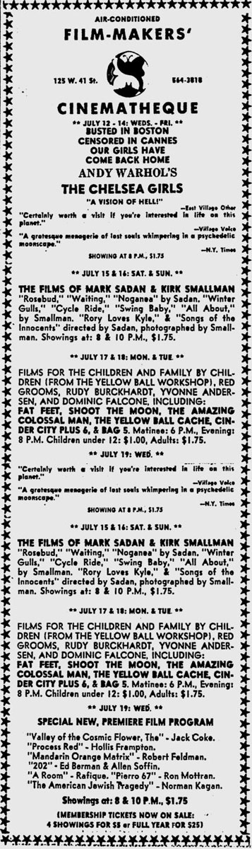 On July 12, The Chelsea Girls returned to the Film-Makers' Cinematheque in New York (still operating out of W. 41st.) for a few nights - it ran July 12th to the 14th. The ad proclaimed that it had been "busted in Boston" and "censored in Cannes". (The same ad advertised "Films for the children and family by children...." on other nights).