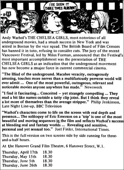 Andy Warhol's Chelsea Girls is to be shown at the National Film Theatre by the New Cinema Club once in February once in March in all night program of films. There is an interesting story attached. Like many of the impoverished N.Y. film-makers Mr. Warhol will always sell the rights of his films to the highest bidder. In this case Mr. Louis Scher, who seems to have been quite unaware of the existence of a censor in this country - perhaps he hadn't seen the film. Originally scheduled to run 7 1/2 hours Warhol reduced the length of the picture (a revelation of the vice and delights of the life in the Chelsea hotel in N.Y.) to 3 1/2 hours by the simple and highly successful device of running two reels at once (the order in which they are shown varies - the soundtrack is a mix). Since then it has doubtless changed hands several times. It has been before the censor more than once. Then about six weeks ago in what one can only interpret as a last attempt to make the grade THE FILM WAS CUT BY FIVE AND A HALF HOURS: it will run at the N.F.T. for two hours on one screen. I hasten to add that Mr. Derek Hill is only putting it on as he is convinced that its owners will never allow the full version to be shown, and he feels that some Chelsea Girls is better than none." (DC)