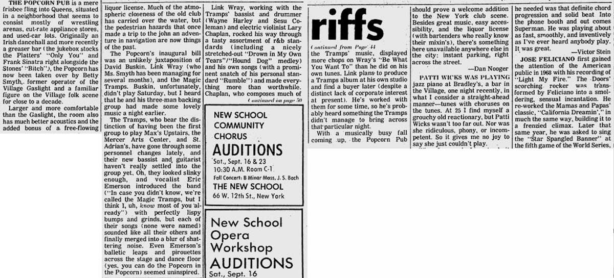 According to the "This Aint the Summer of Love" website, "On June 13, 1972, the Dolls began 17 straight Tuesdays in the 200-capacity Oscar Wilde Room, supporting Satan the Fire Eater and the Magic Tramps which included late singer Eric Emerson (who's death [in 1975] inspired Lou Reed's 'Street Hassle') and future Blondie guitarist Chris Stein." But the N.Y. Dolls lead singer, David Johansen, said in the quote above that the Dolls were offered "a night of our own" at the Oscar Wilde Room. The Tramps were not mentioned in the advertising in the Village Voice so if they did perform with the Dolls during this period, it was probably as the support band - if they performed at all. The ads also show that the Dolls played in the Oscar Wilde Room for five Tuesdays rather than 17.