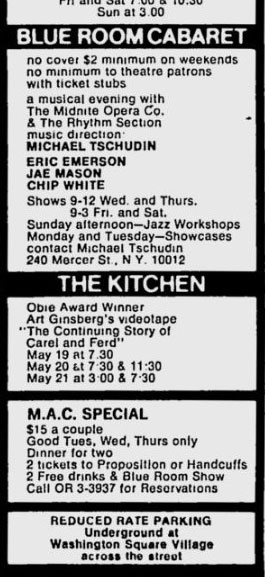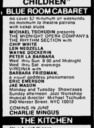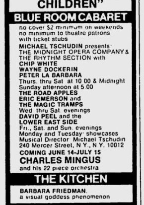 Although the June 8th ad suggests that "Eric Emerson and The Magic Tramps" are going to perform "Wed thru Sat. evenings," they were not mentioned in the Blue Room ad after the June 8th issue. Charles Mingus was advertised in the Blue Room for the ads in the June 15th, 22nd, 29th and July 6th issues of the Voice, followed by the Midnight Opera Company in the July 13th ad.