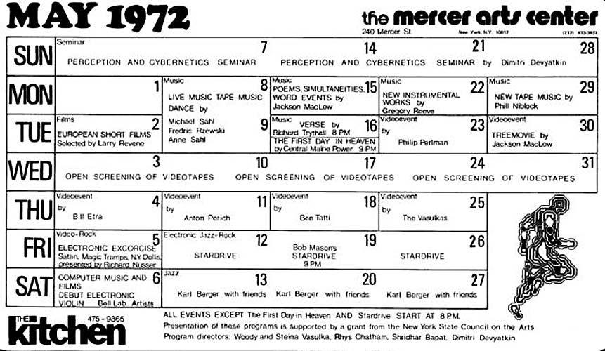 The earliest documentary evidence I have found of The Magic Tramps performing at the Mercer Arts Center is a May 1972 schedule that appears in the archives of the vasulka.org website here. "The Kitchen," as per the bottom of the image, was operating out of the Mercer Arts Center at the time. (See Vasulka documents for more documents regarding The Kitchen during 1971 - 1973.)