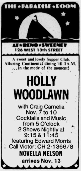 By November, Holly Woodlawn, having split from Elda's pre-Stillettos band, Pure Garbage, was being advertised as a solo act at Reno Sweeneys: