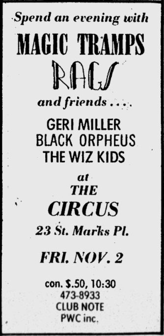 The Magic Tramps continued to perform without Eric. In the same issue of the Village Voice that Eric was mentioned in, there's also an ad for the Tramps and Eric isn't included on the ad, although Warhol star Geri Miller, the stripper in Trash, was part of the show. She had sometimes performed with Tramps in their previous shows.