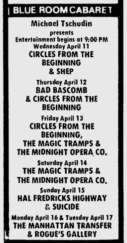 Billed as "Eric Emerson and the Magic Tramps" they are listed in the the Mercer ad in the January 4, 1973 issue of the Voice (for performances on January 5 and 6) and in the Mercer ad in the January 25th issue of the Voice (for performances on January 26 and 27). They are not listed in the rest of the ads for January and there is no mention of them in the February or March ads. The Tramps, on their own, appear in the ad in the April 12, 1973 issue of the Voice. There is no mention of Eric in the ad.
