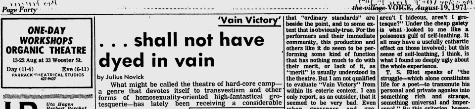 The Village Voice review of Vain Victory appeared in the August 19, 1971 issue of the Village Voice: