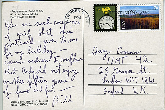 He was grateful for having lived such a long time. On one of his many birthdays he had been sent an "Andy Warhol Dead at 58" postcard which he then sent to me with his own message.